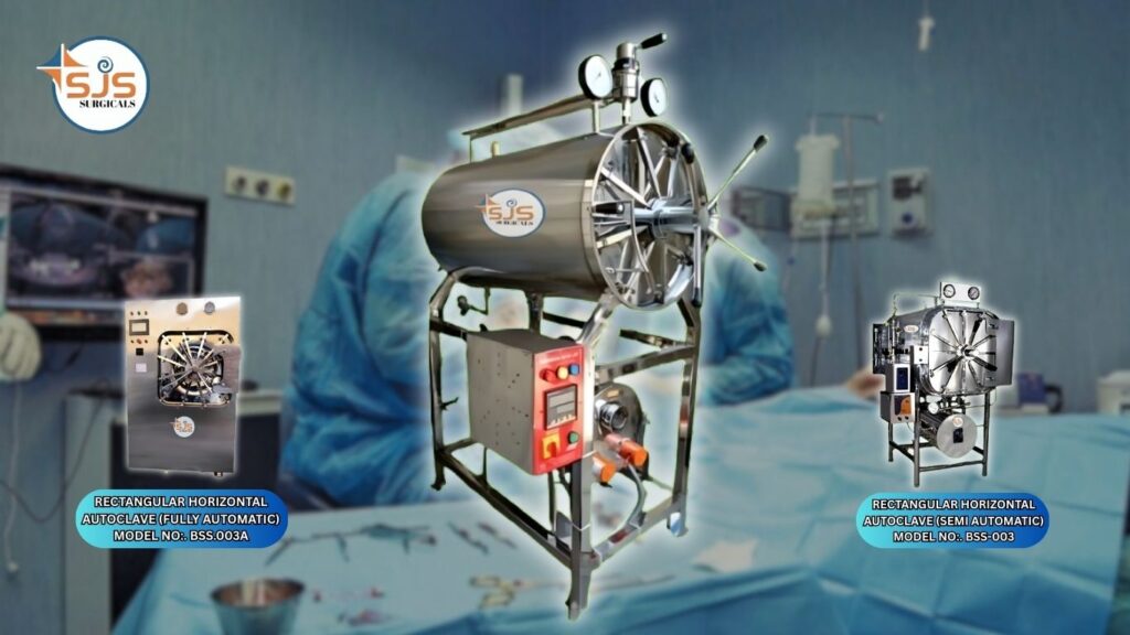 SJS Surgical have wide range Of horizontal Autoclaves. Semi Automatic cylindrical Autoclave will be front loading and in Horizontal shape with triple layer with boiler. These high pressure front loading play important role in sterilization procedure required in hospitals, pharmaceutical companies, bio pharma & microbiology lab Horizontal Autoclave unit are made of SS to